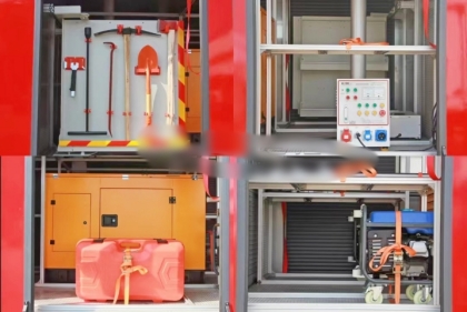 駕駛室頂部前端為長排警燈,車身后配有24V/60W火場照明燈一只,車輛兩側(cè)上方各配有紅藍(lán)相配的爆閃燈,下方安裝安全標(biāo)志燈,乘員室、器材箱、 泵房內(nèi)均裝有照明燈,加裝有100W警報(bào)器,回轉(zhuǎn)警燈開關(guān)、通訊設(shè)備預(yù)備接口。